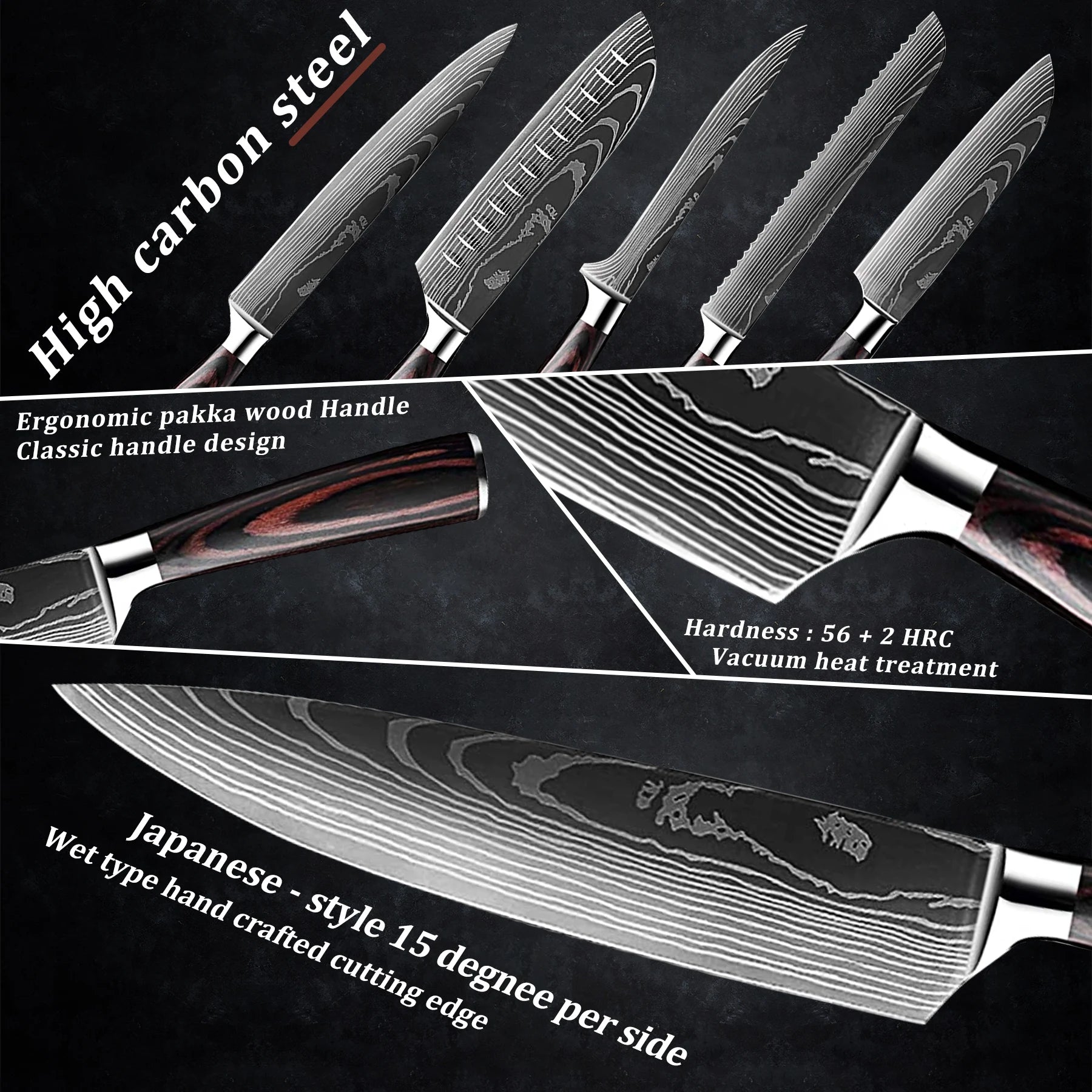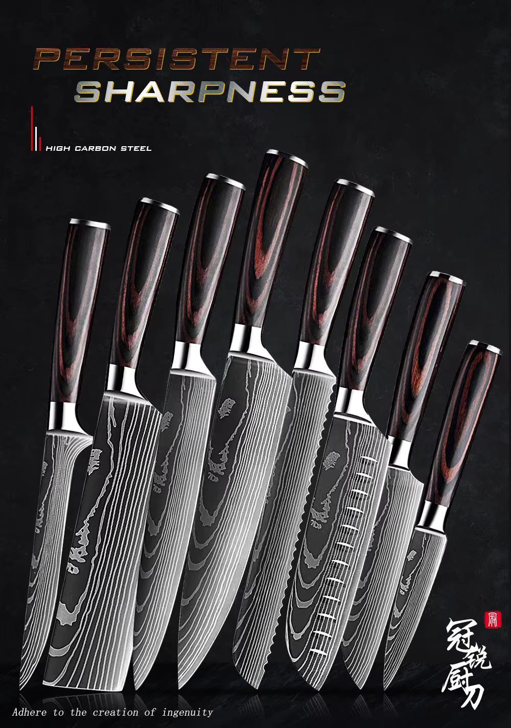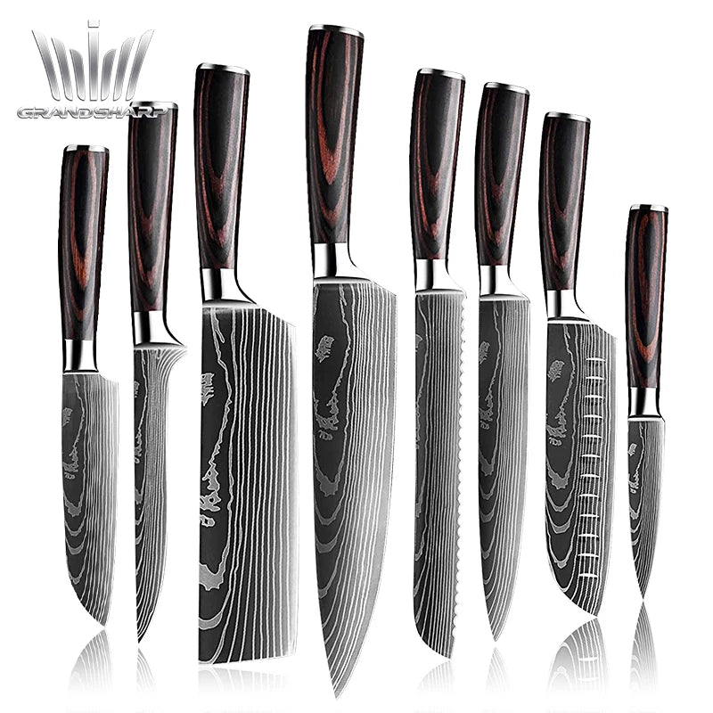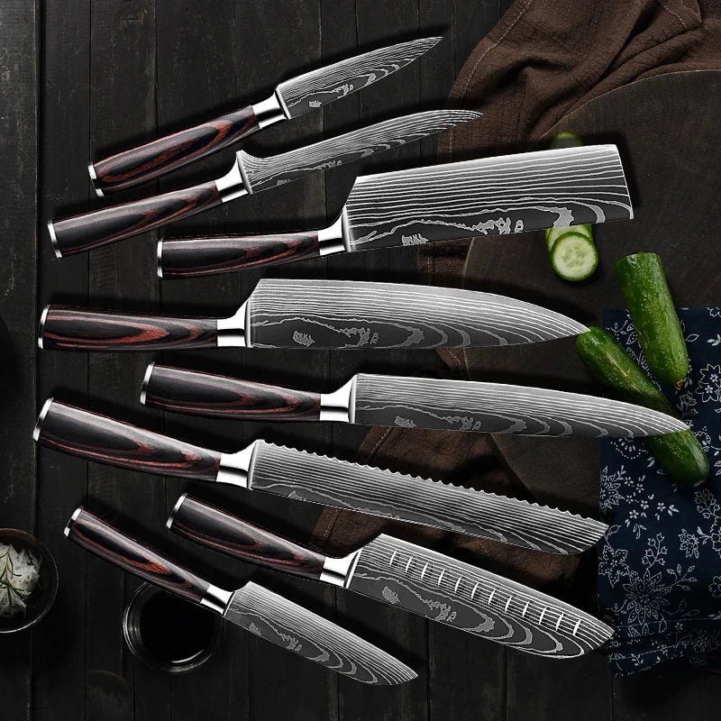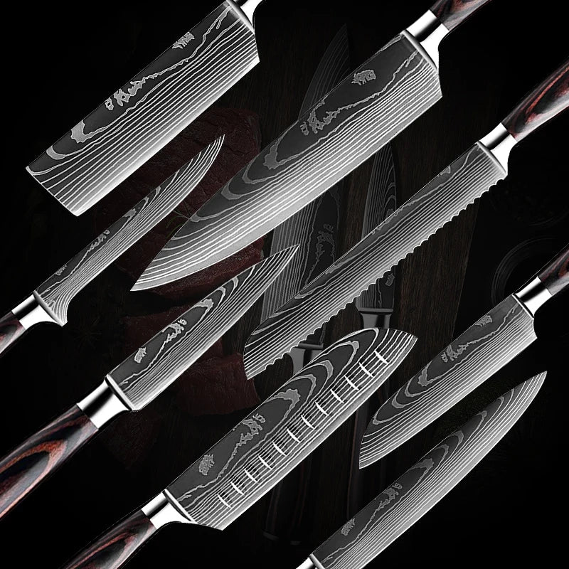 Professionele en stijlvolle 8-delige Messenset met Damascus patroon