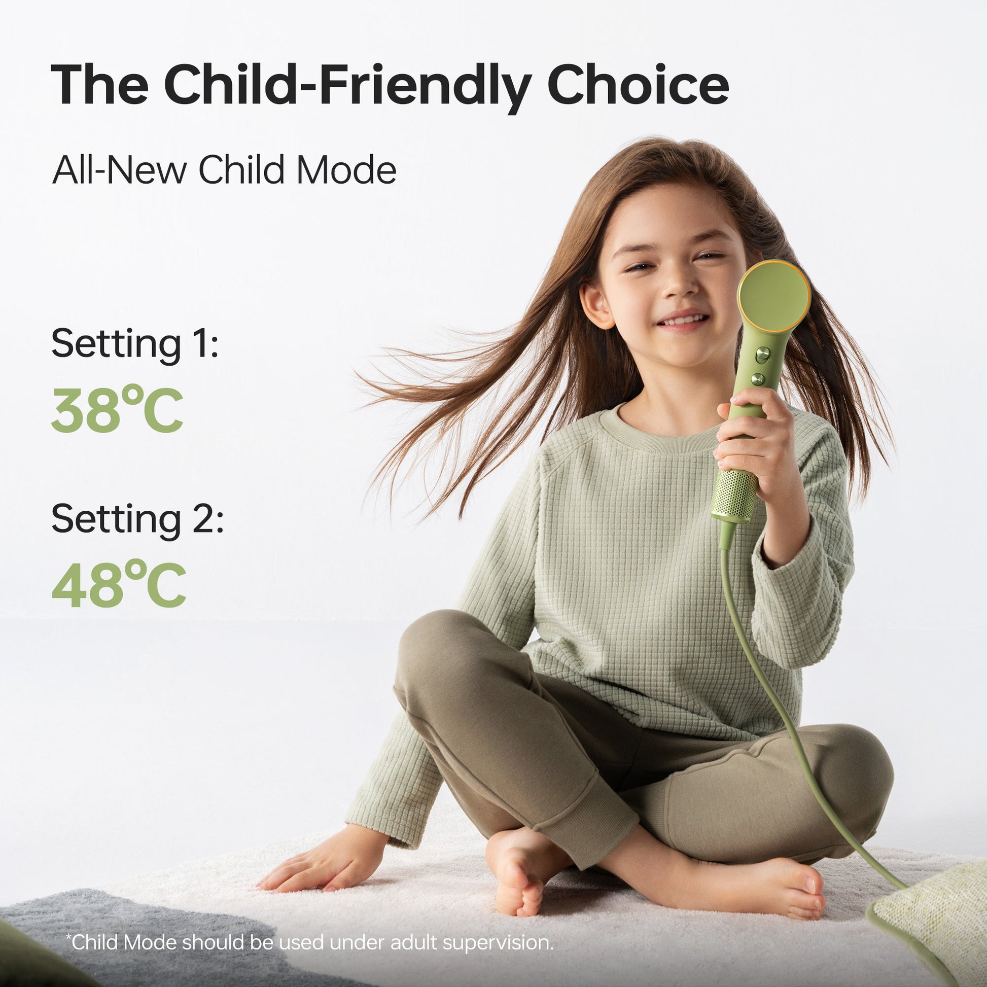 KINDVRIENDELIJK – De nieuwe kinderstand is extra zacht voor fijner haar, en maakt het veiliger om kind haar te drogen. Twee standen: lage snelheid 38°C en hoge snelheid 48°C.