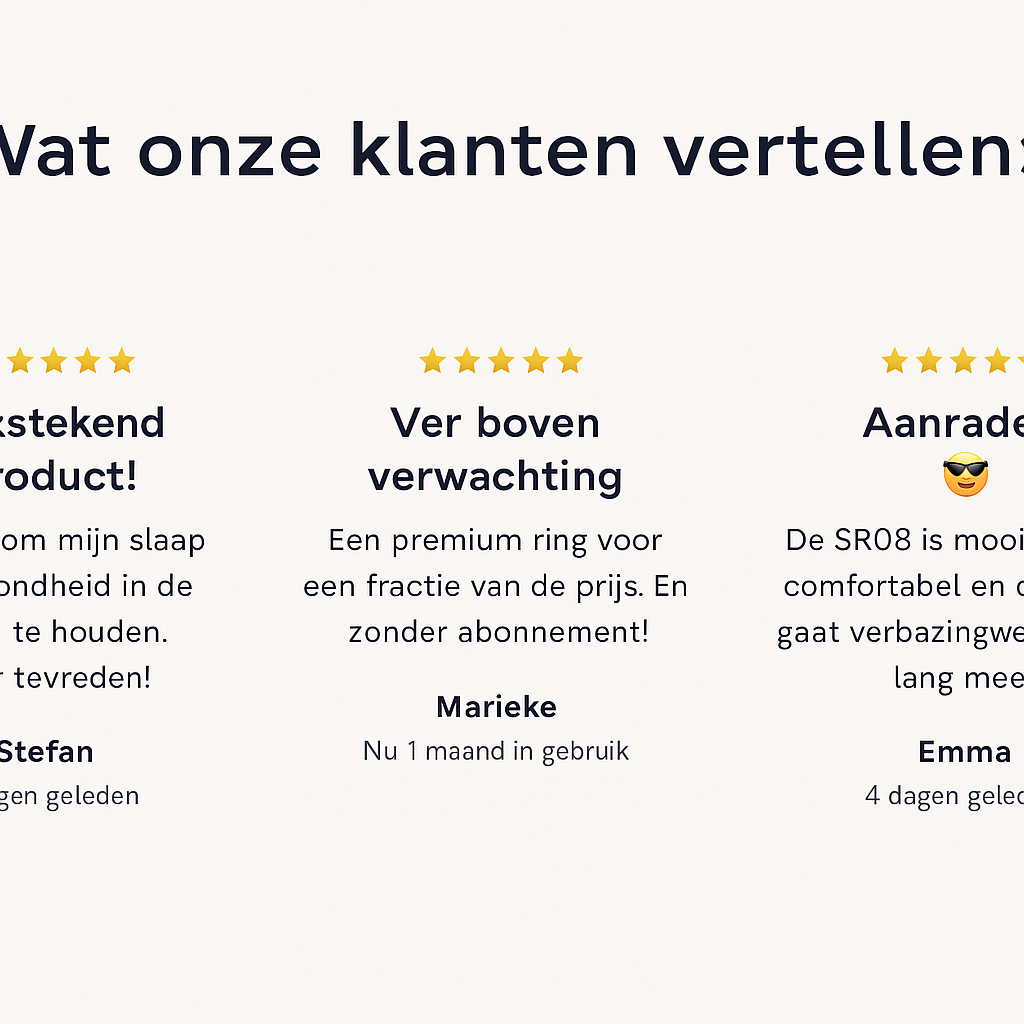 De SR08 meet continu je hartslag, micro-bewegingen en doorbloeding. Deze gegevens worden gecombineerd in de JRing-app, waar je direct inzicht krijgt in: