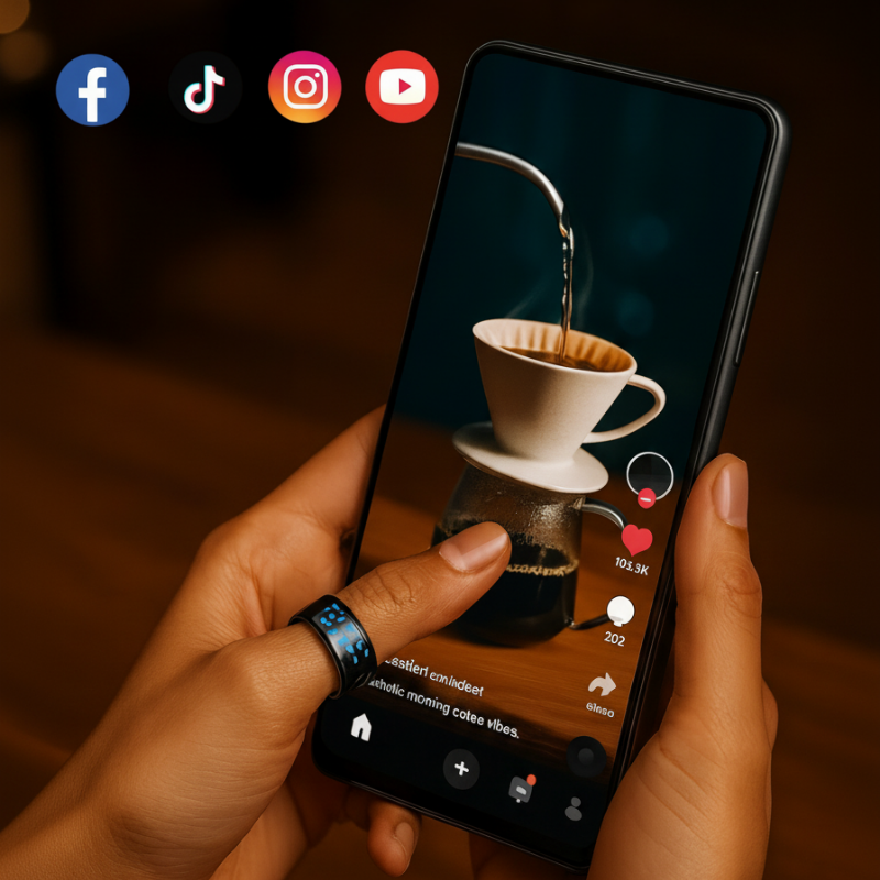 De SR08 bevat een bewegingssensor. Wanneer je de ring licht schudt, stuurt hij een signaal naar je telefoon via Bluetooth. Daardoor kun je handsfree swipen door: